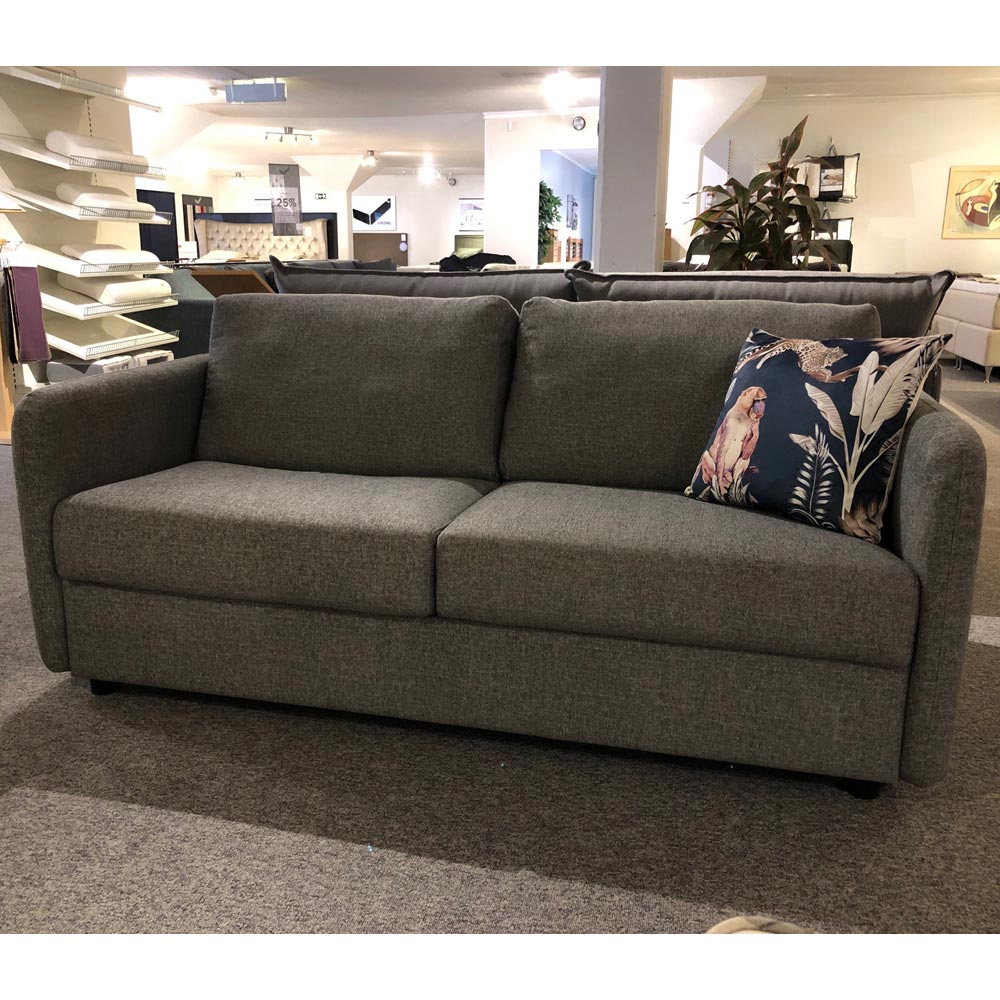 New Scandic framåtbäddad bäddsoffa i tyg Amadeus dark grey från Hovden. En nätt och praktisk bäddsoffa där sits- och ryggkuddar sitter kvar på soffan när bädden fälls fram.