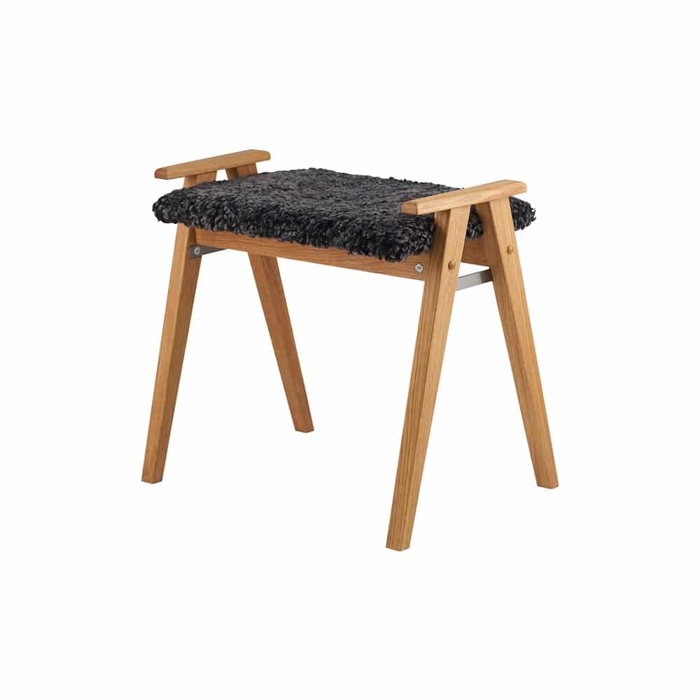 Alme pall i oljad ek/ fårskinn mörkgrå från Oscarssons Möbel. Alme är en svensktillverkad liten nätt pall. En fin detalj är handtagen på sidorna. En perfekt hallmöbel att sitta på när du knyter skorna!
