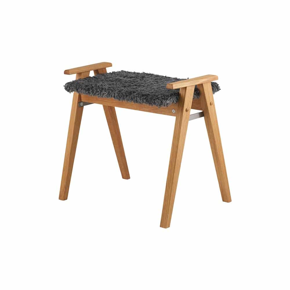 Alme pall i oljad ek/ fårskinnslook mörkgrå från Oscarssons Möbel. Alme är en svensktillverkad liten nätt pall. En fin detalj är handtagen på sidorna. En perfekt hallmöbel att sitta på när du knyter skorna!