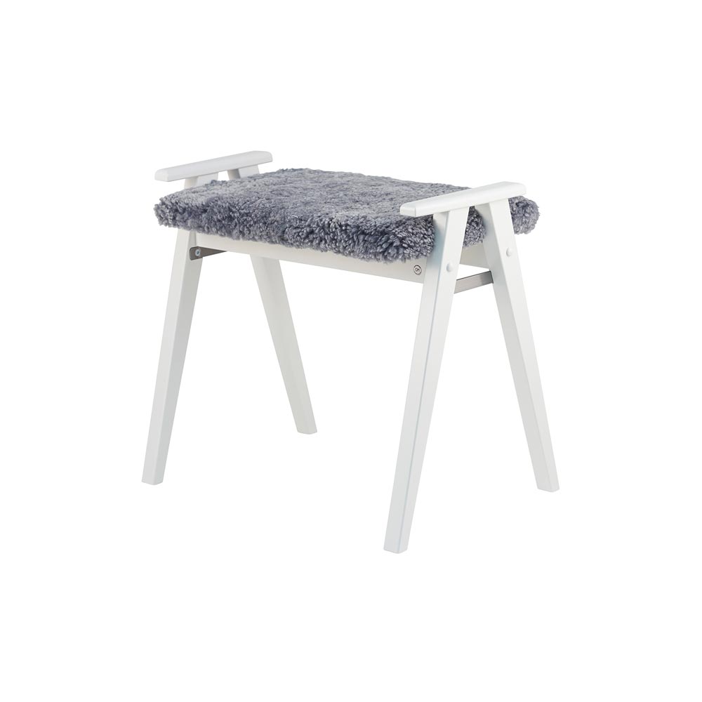 Alme pall i vitlack/ fårskinn ljusgrå från Oscarssons Möbel. Alme är en svensktillverkad liten nätt pall. En fin detalj är handtagen på sidorna. En perfekt hallmöbel att sitta på när du knyter skorna!