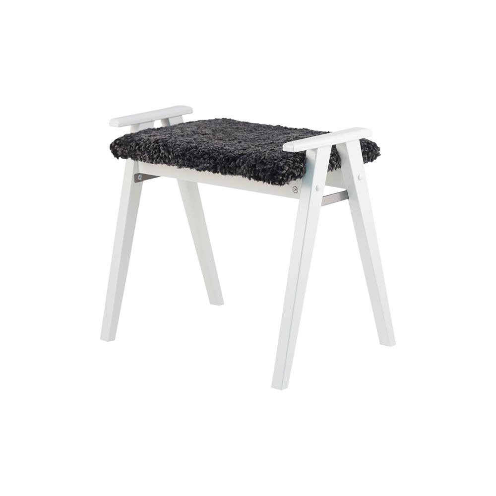 Alme pall i vitlack/ fårskinn mörkgrå från Oscarssons Möbel. Alme är en svensktillverkad liten nätt pall. En fin detalj är handtagen på sidorna. En perfekt hallmöbel att sitta på när du knyter skorna!