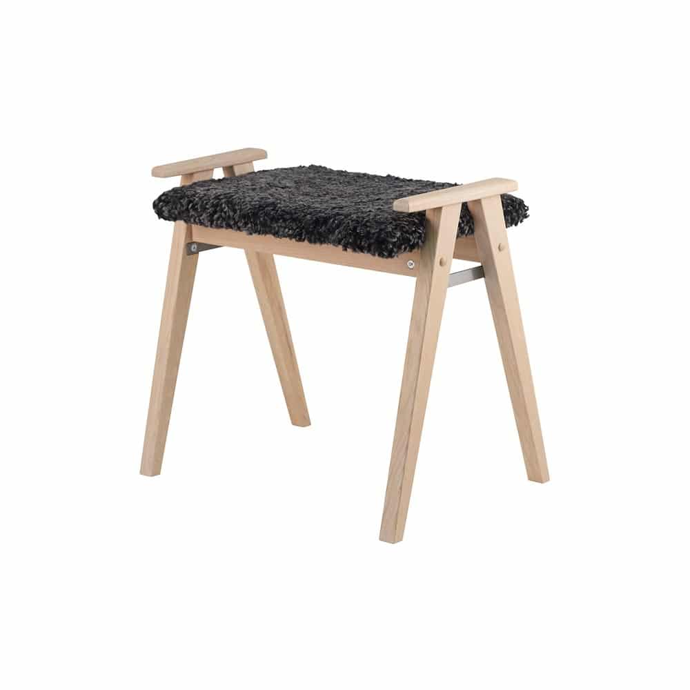 Alme pall i vitpigmenterad ek/ fårskinn mörkgrå från Oscarssons Möbel. Alme är en svensktillverkad liten nätt pall. En fin detalj är handtagen på sidorna. En perfekt hallmöbel att sitta på när du knyter skorna!