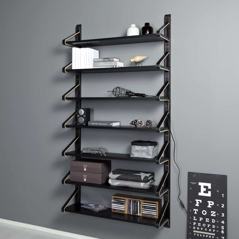 Link vägghängd hylla i snygg retrostil designad av finske Tapio Anttila. Tillverkad av Rotola Pukkila i Finland. Link vägghängd hylla ingår i ett byggbart förvaringsystem. Hyllplanen vilar på formpressade träkonsoler vilket ger Link ett luftigt och smäckert intryck. Tillverkad i svartbetsad ek. Levereras omonterad.