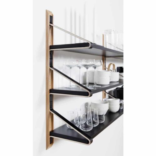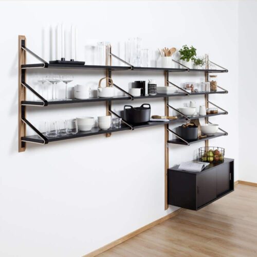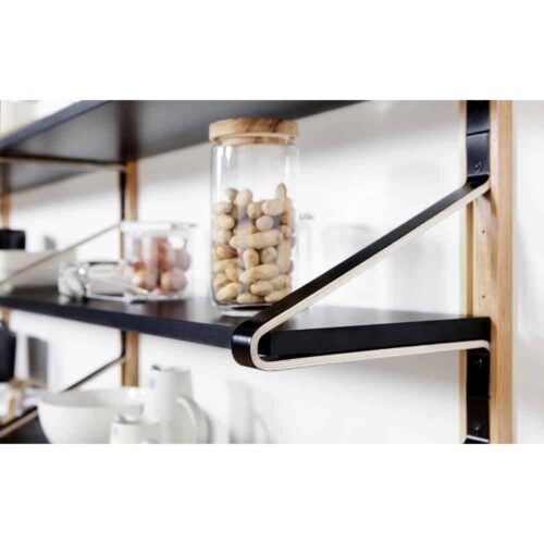 Link vägghängd hylla i snygg retrostil designad av finske Tapio Anttila. Tillverkad av Rotola Pukkila i Finland. Link vägghängd hylla ingår i ett byggbart förvaringsystem. Hyllplanen vilar på formpressade träkonsoler vilket ger Link ett luftigt och smäckert intryck. Tillverkad i lackad ek/ svartbetsad ek. Levereras omonterad.