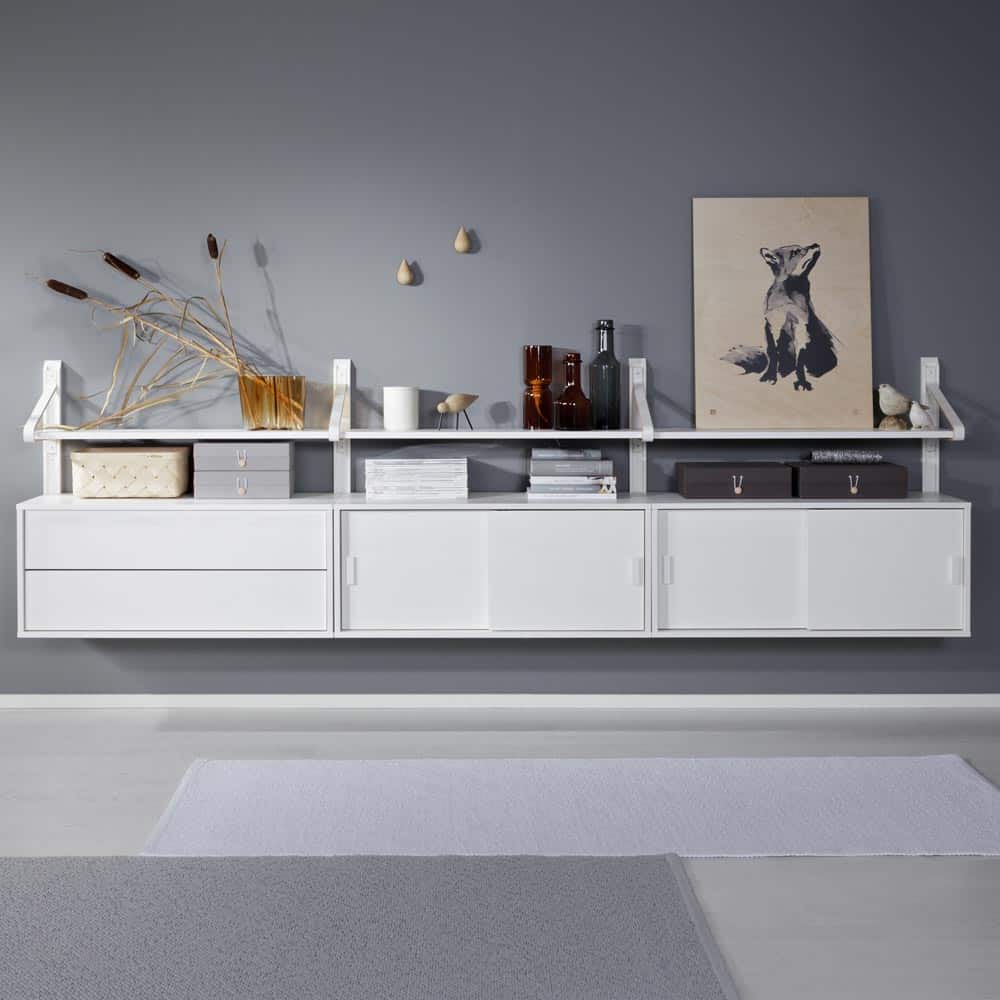 Link har 3 olika höjder på väggfästena samt 2 olika bredder på hyllplanen; 60cm eller 90cm. Önskar man täckt förvaring finns stommar med 2 skjutdörrar eller 1 samt 2 pushlådor.