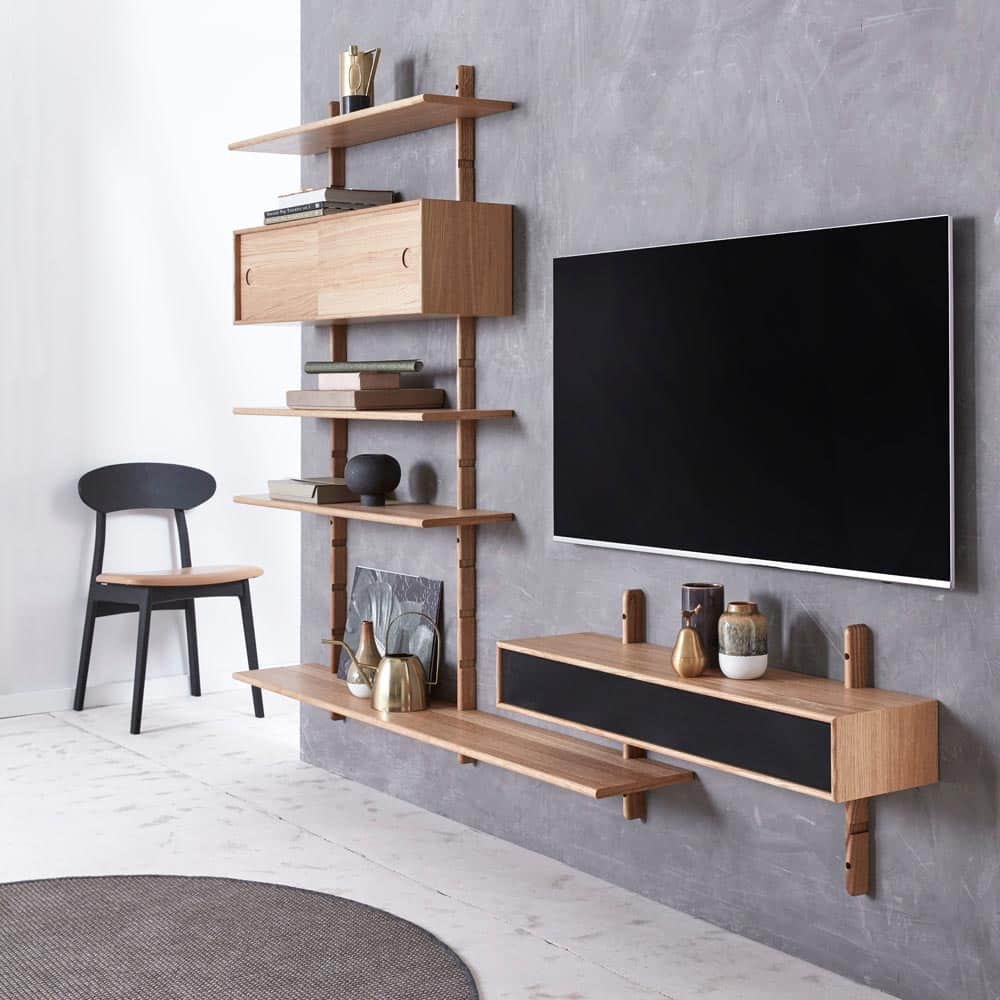 Moore byggbart hyllsystem finns att köpa i oljad ek, vitpigmenterad ek, svartbetsad ek och valnöt. Välj mellan olika delar och bygg ihop din egen drömhylla.
