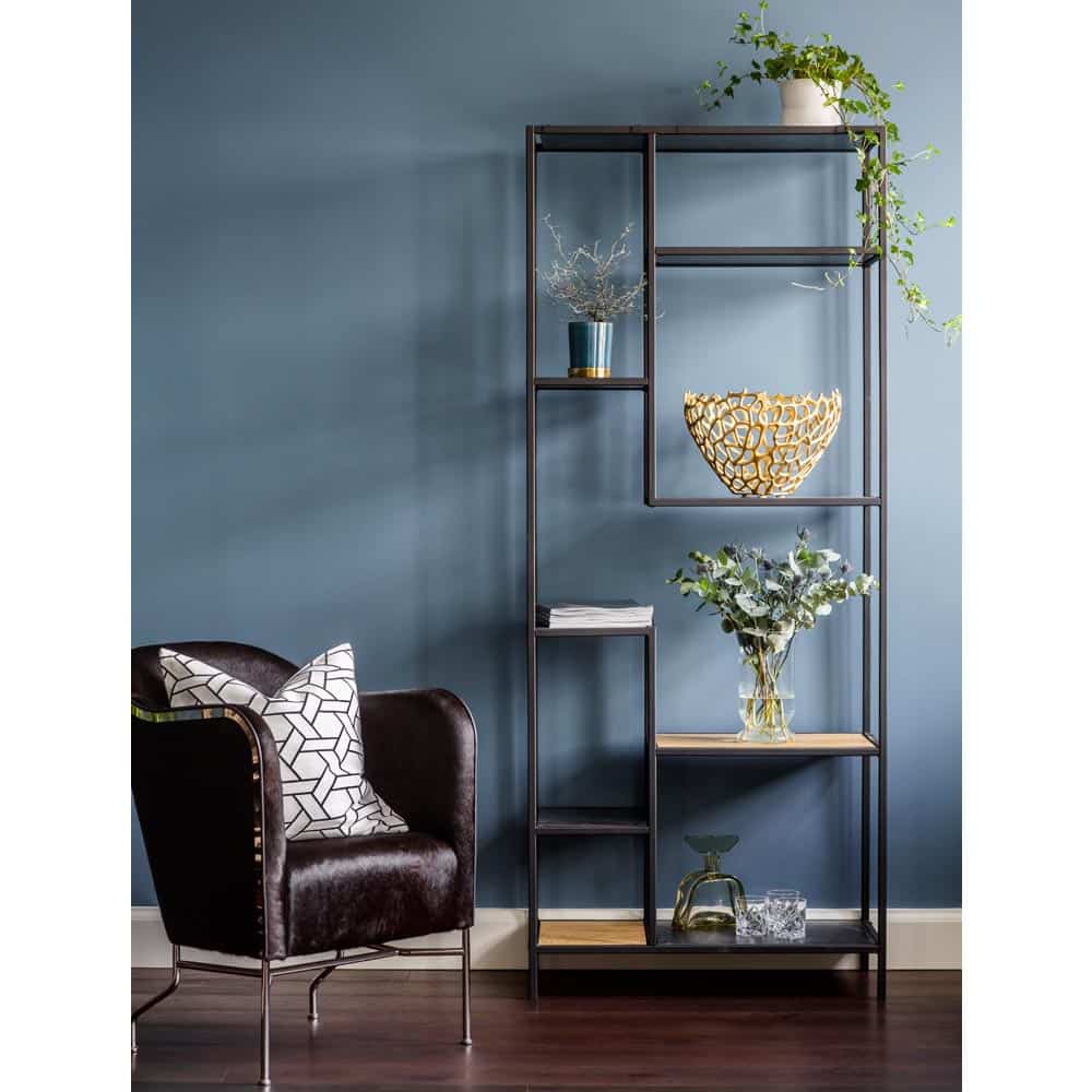 Steel hylla rymmer totalt 10st hyllplan, 5st 24*34cm och 5st 49*34cm. Välj mellan hyllplan i oljad ekfanér eller grå betonglaminat.