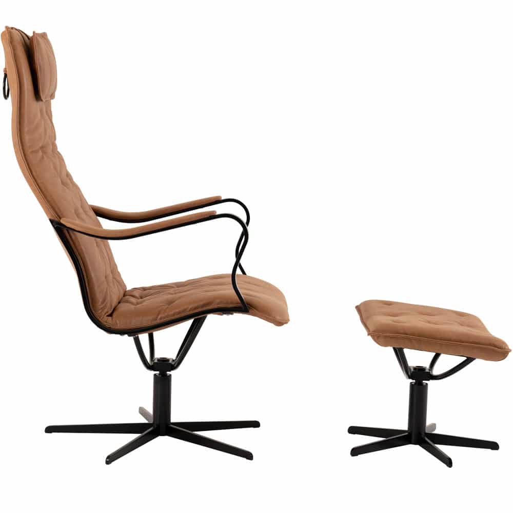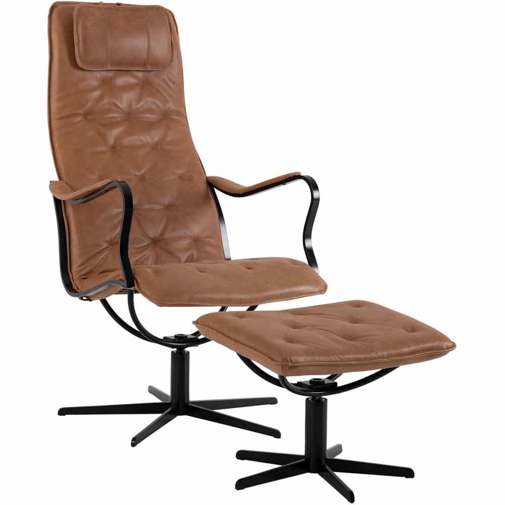 Chic fåtölj inkl. fotpall i läder Vintage cognac från småländska Bröderna Anderssons. Underrede och armledare i svartlackad metall. Snyggt pikérad sits & rygg. Chic fåtölj har snurrfunktion och nackkudden kan enkelt höjdregleras.