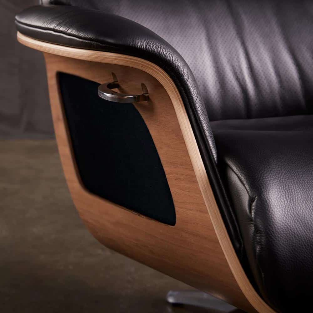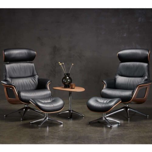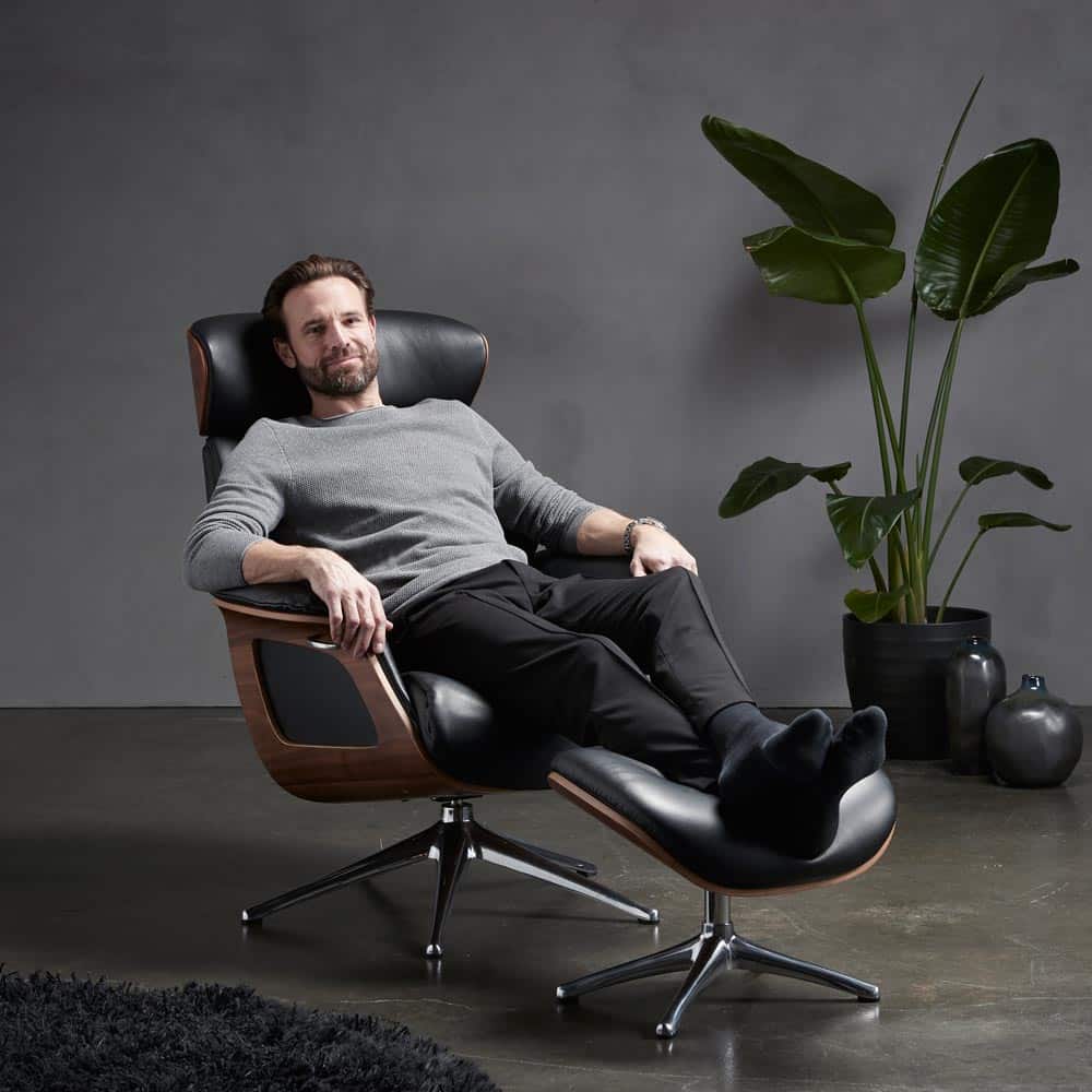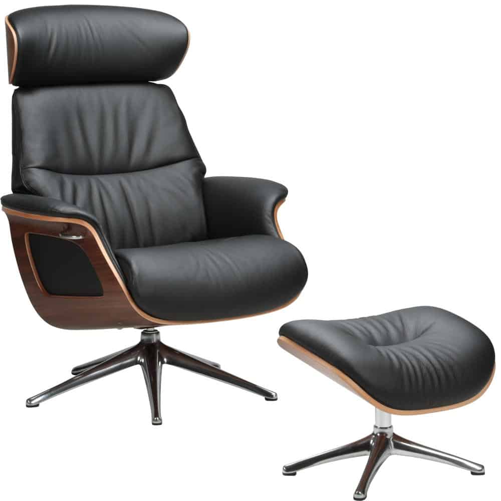 Clement fåtölj & pall – läder savoy black/ valnöt/ krom