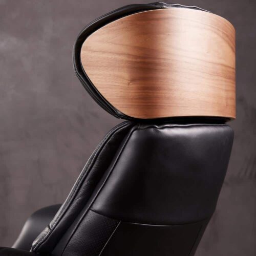 Clement fåtölj medium och fotpall från danska Flexlux med en fantastisk komfort. Läder Savoy platin black 0960, utsida armstöd + nackstöd med valnötsfanér och benställning i krom. Ställbart ryggstöd, nackstöd som är höj- och sänkbart samt även vinkelbart. Snurrfunktion på fåtöljen.