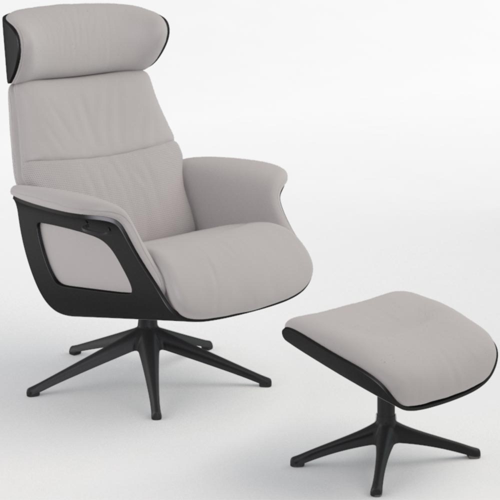Clement fåtölj medium och fotpall från danska Flexlux med en fantastisk komfort. Läder Savoy light grey 0967, utsida armstöd + nackstöd med svartbetsat ekfanér och benställning i svartlackad metall. Ställbart ryggstöd, nackstöd som är höj- och sänkbart samt även vinkelbart. Snurrfunktion på fåtöljen.