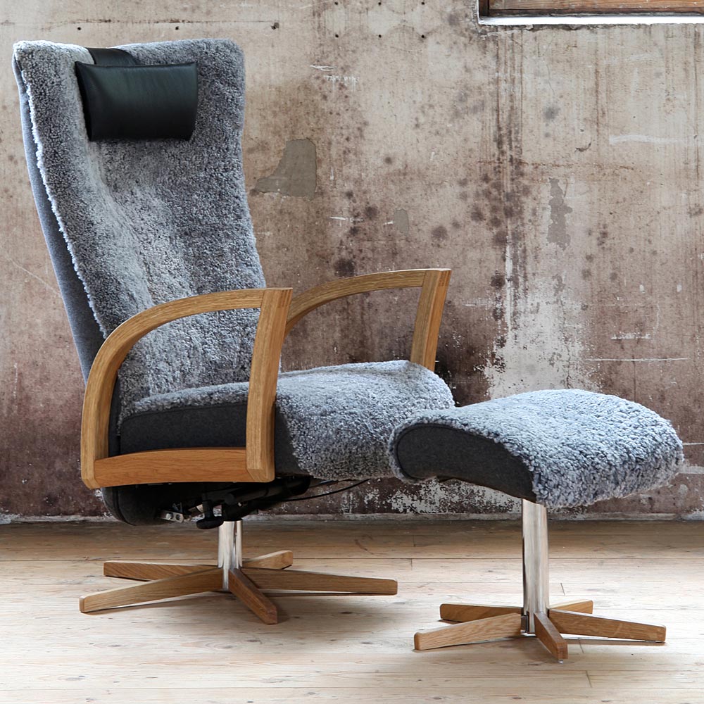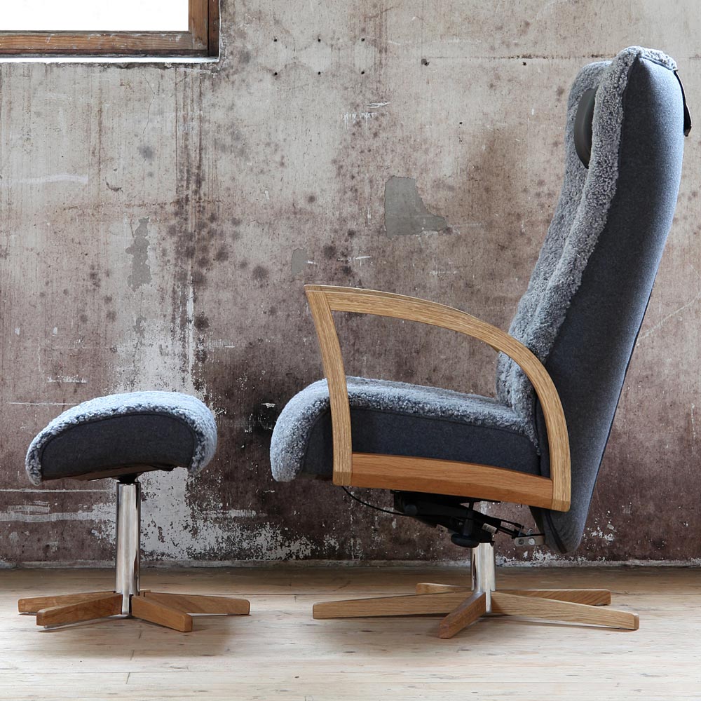 Focus snurrfåtölj + pall. Fårskinn Skinnwille Grey/ oljad ek. Tyg Facet 4 Mörkgrå på baksida/ sidor. Nackkudde i svart läder eller