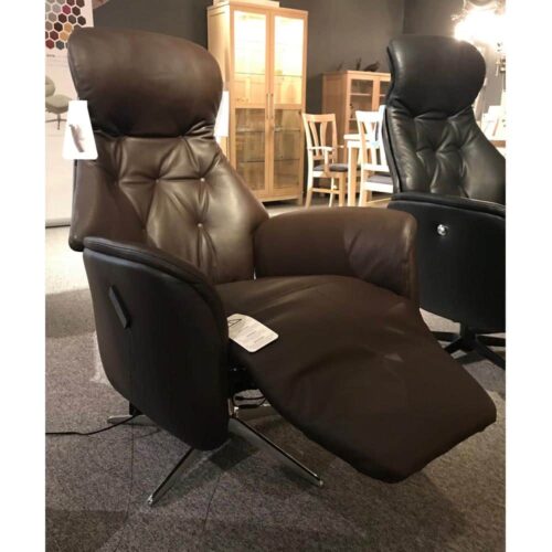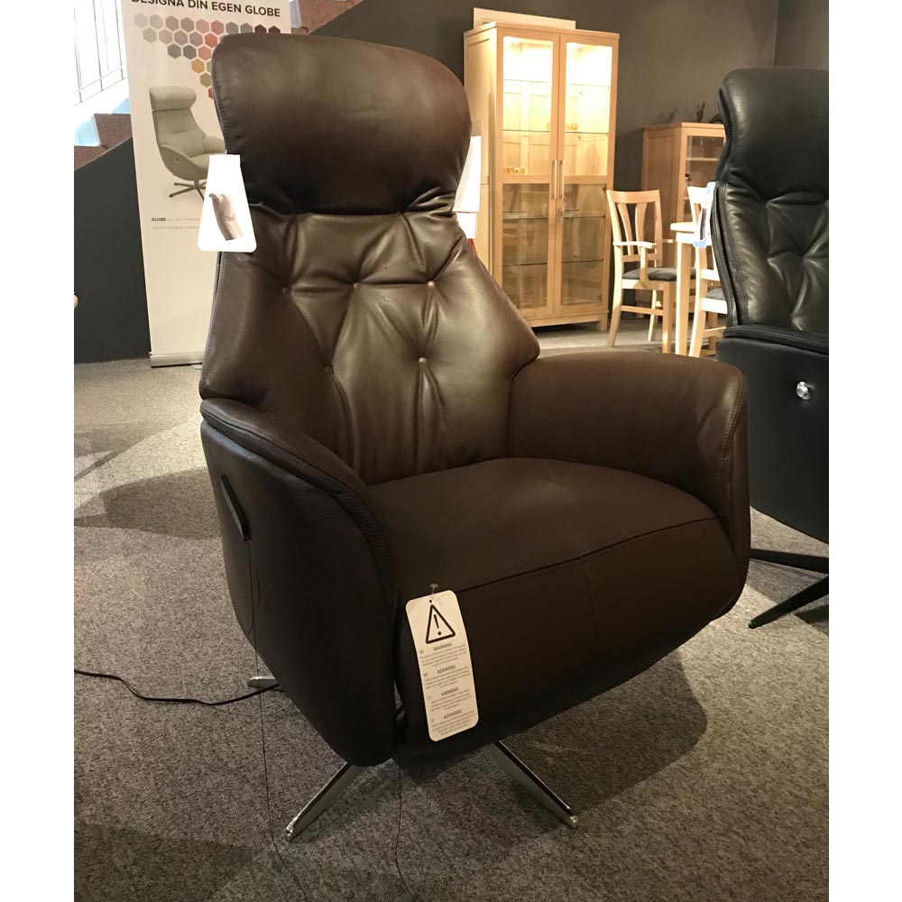 Hamilton reclinerfåtölj från danska Hjort Knudsen. Fåtölj med inbyggt fotstöd och ställbar rygg. Fåtöljen är klädd i ett mjukt anilin läder, har snygga pikeringar i ryggen och underrede i krom. Välj mellan manuell eller elektrisk funktion. Fåtöljen på bilden är klädd i 485 dark brown.