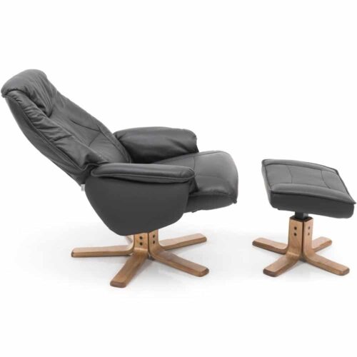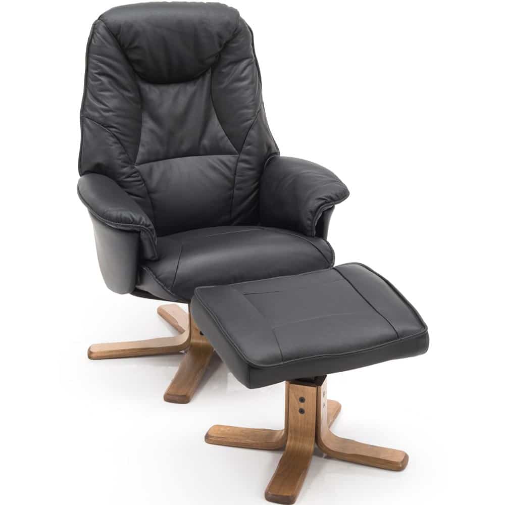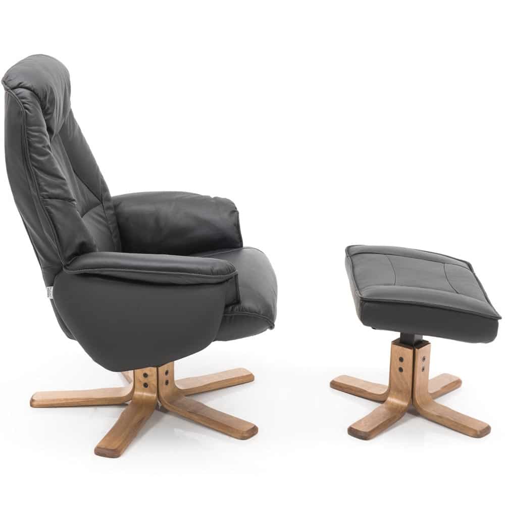 Palermo fåtolj inkl. pall i läder Madras 274 svart/ skai. Underrede kryssfot ekbets. Fällbart ryggstöd och snurrfunktion. Begränsat antal!