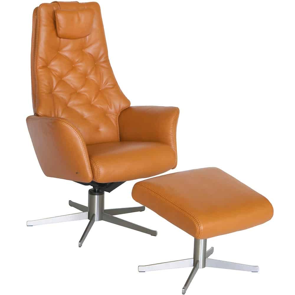 Ruby fåtölj och pall från finska BD Möbel. Ställbar rygg och vinkelbart nackstöd. Dessutom en lös nackkudde för extra komfort. Mjukt och skönt anilinläder. Snygg dekorativ rygg med indragningar. En mycket skön kvalitétsfåtölj! Metallunderrede Elegance.