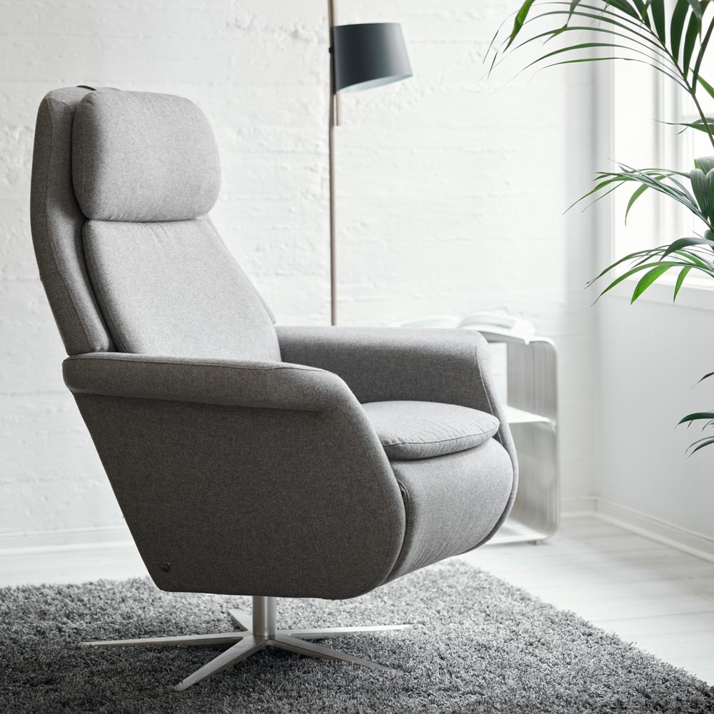 Stressless Sam reclinerfåtölj i tyg Calido light grey från norska Ekornes. Underrede Sirius i borstad aluminium.