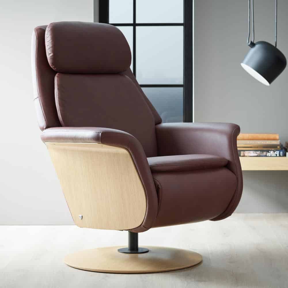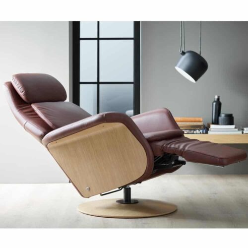 Stressless Sam Wood reclinerfåtölj i läder Paloma maroon/ ek natur från norska Ekornes. Underrede Disc Base ek natur.
