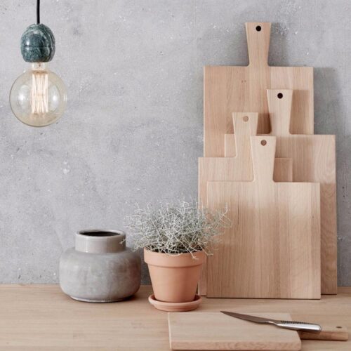Serveringsbrädorna är tillverkade i massiv ek som har ett högt innehåll av garvsyra, vilket gör dem antibakteriella. Ek är också ett naturmaterial som är hållbart och skonsamt mot knivar. Ska dock inte maskindiskas men alla ytor diskas med diskmedel. Finns i tre olika storlekar.