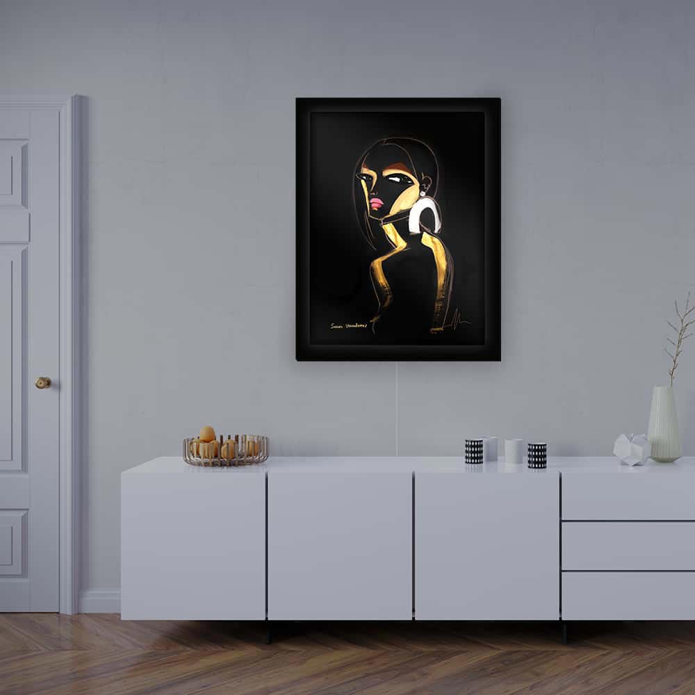 För Glasvision har Sara tagit fram en kollektion med skimrande målningar mot mörk bakgrund. En konstfull kollektion bestående av två modeillustratoiner och en lekfull häst i rörelse. Motiven är målade för hand med akryl, torrpastell, oljepastell samt guld- och silverfärg på svart papper sedan tryckta på glas där varje motiv är komplett utrustat med LED-belysning.