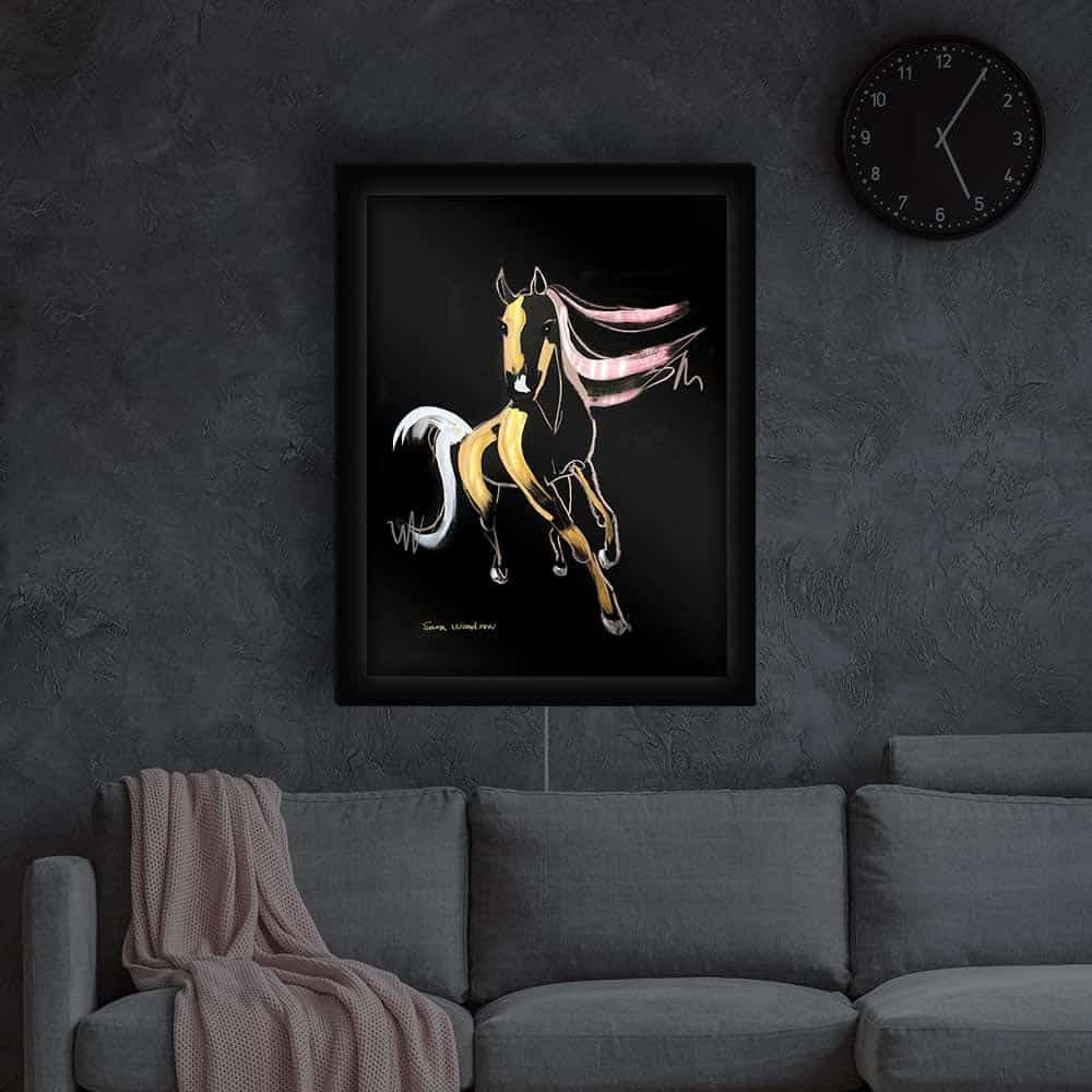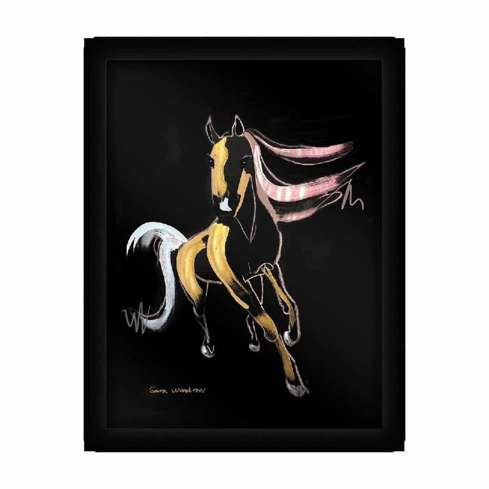För Glasvision har Sara tagit fram en kollektion med skimrande målningar mot mörk bakgrund. En konstfull kollektion bestående av två modeillustratoiner och en lekfull häst i rörelse. Motiven är målade för hand med akryl, torrpastell, oljepastell samt guld- och silverfärg på svart papper sedan tryckta på glas där varje motiv är komplett utrustat med LED-belysning.