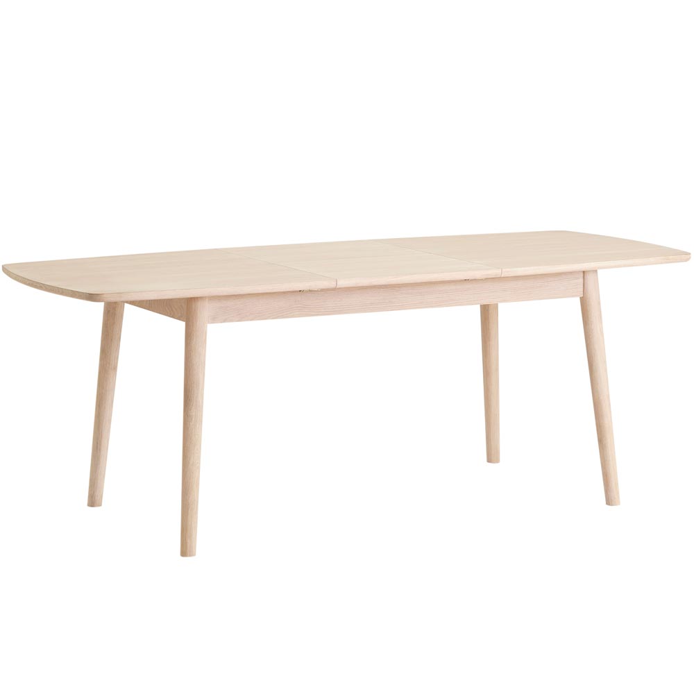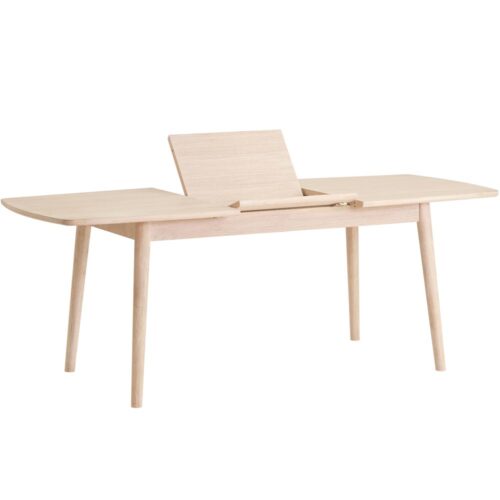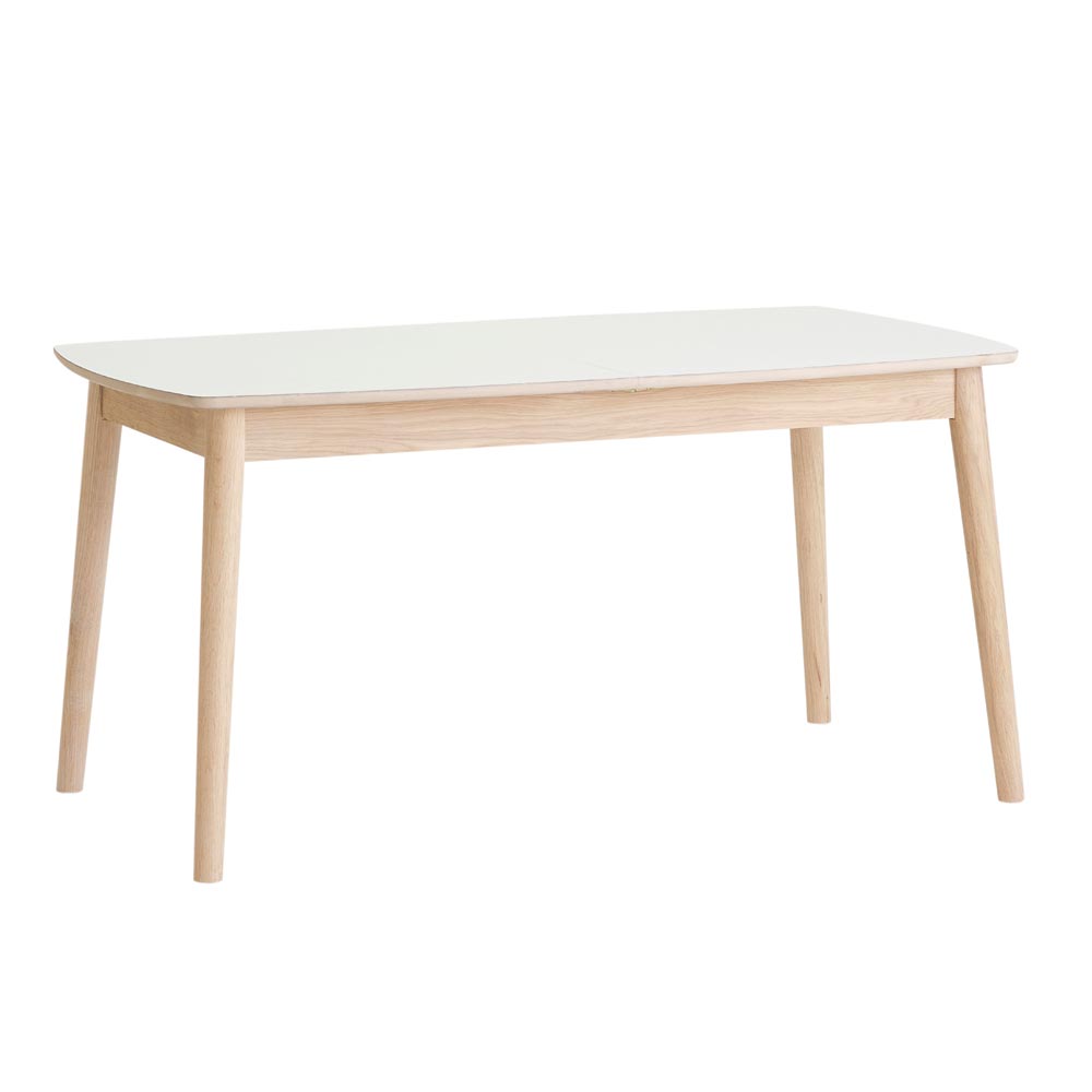 Matbord 121 från danska Casö med bordsskiva i vitt laminat/ underrede i massiv vitoljad ek. Mjuk fin form på ben och bordsskiva. Inkl. 55cm butterflyilägg.
