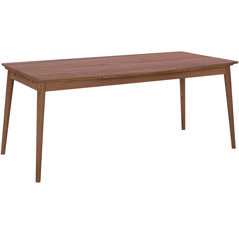 Curve matbord i fanerad /massiv oljad valnöt från danska PBJ. Ett stilrent matbord med en något svängd bordsskiva som förlängs med s.k. Holländskt utdrag, där en tilläggsskiva kan dras ut i varje kortsida. Dessa skivor ligger under den vanliga bordsskivan. Curve matbord är designat av Morten Svendsen och Michael H. Nielsen.