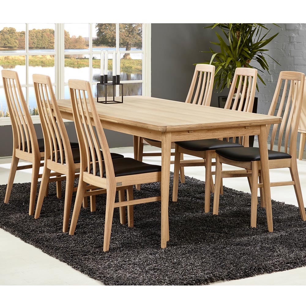 Eva stol levereras med svart skinnsits och kan även köpas i oljad ek. Casö Matbord 500 i retrodesign förlängs med s.k. Holländskt utdrag,