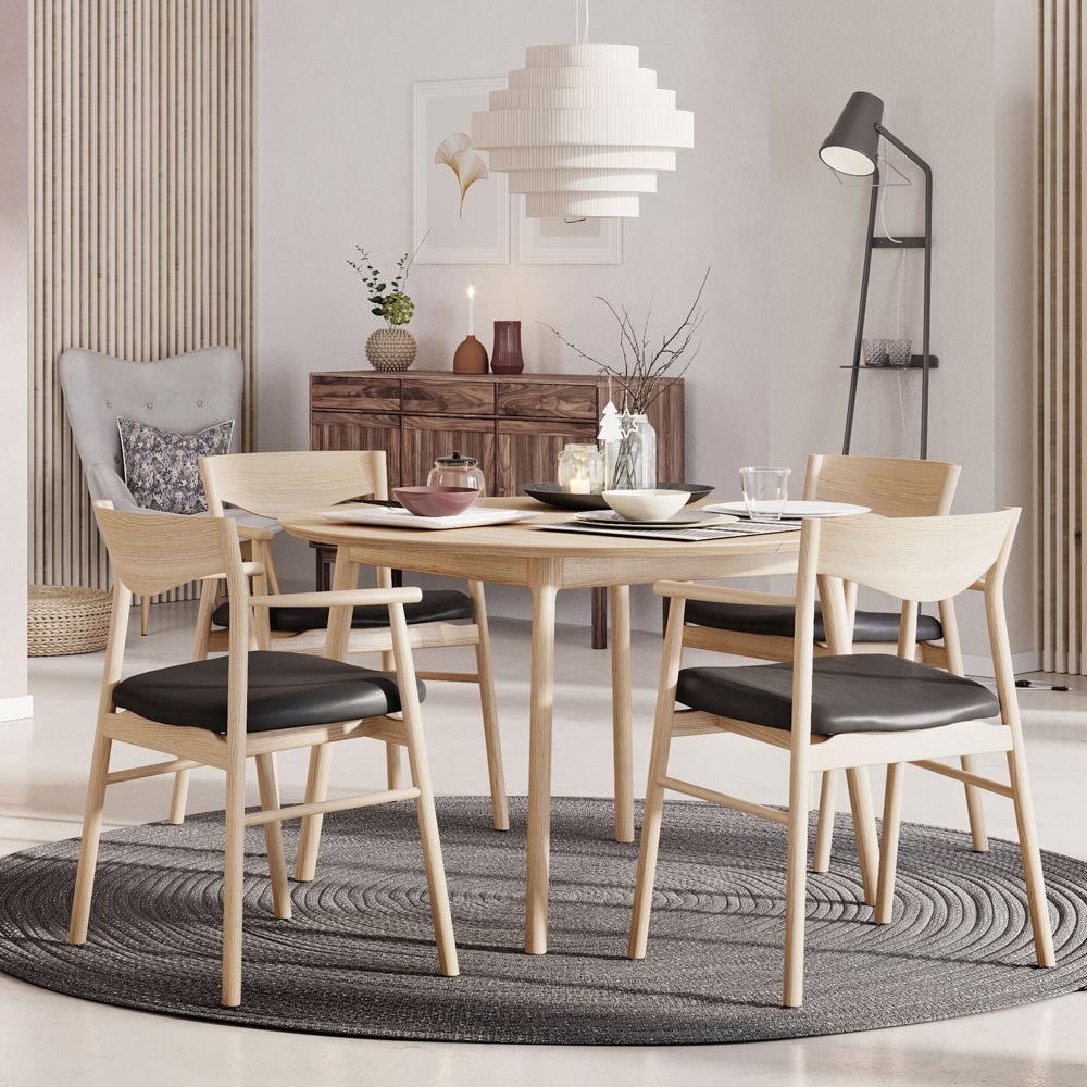 Magrethe karmstol tillsammans med Nord runt matbord från danska Casö. Tillverkat i massiv vitoljad ek med stolssitsar i svart skinn.
