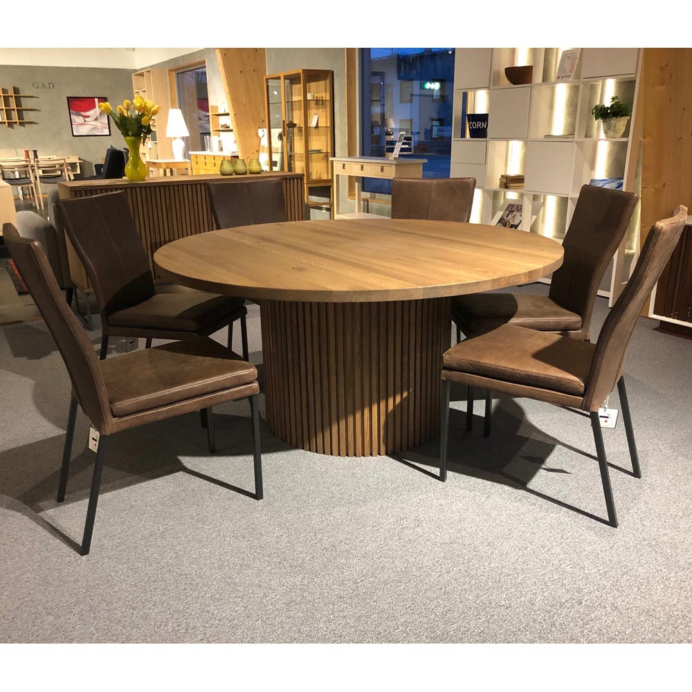 Timo runt matbord i massiv rökt ek. Timo matbord ger ett pampigt intryck med en massiv bordsskiva med en tjocklek på 40mm som mäter 160cm i diametern. En läcker detalj som ger matbordet karaktär är underredet med sina massiva stående trälister. Timo finns även att köpa i andra färger på eken samt lackad eller oljad valnöt. Svart fyllning i kvistarna ger en snygg detalj, som även finns att välja i annan färg.