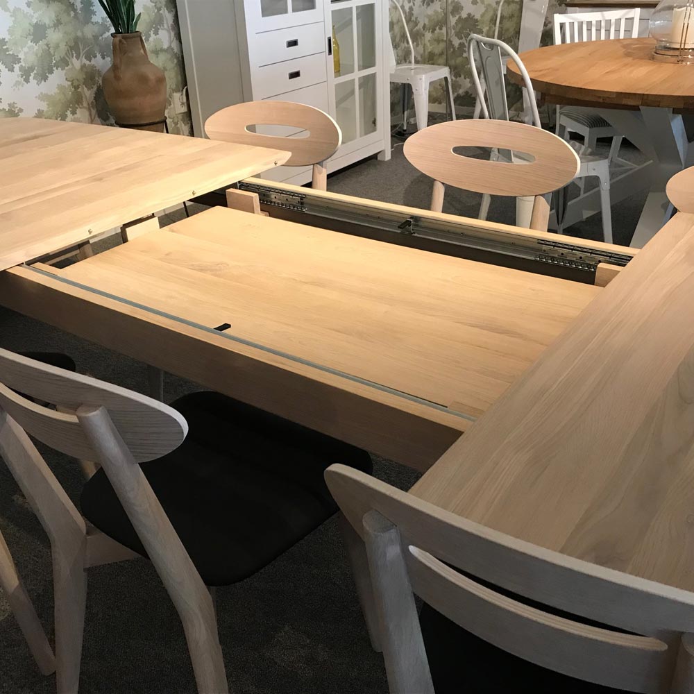 Rock N Roll matbord har en riktigt stabil och praktisk utdragsfunktion. Båda bordsskivorna är synkade med vajer + kullager. Så drar man ut ena skivan så åker även den andra ut. Funktionen glider mjukt och fint och det är väldigt praktiskt om man själv skall förbereda en dukning! Under matbordet finns bra förvaring för iläggsskivor, 50cm 1.180:-/st (plats för 2/st).