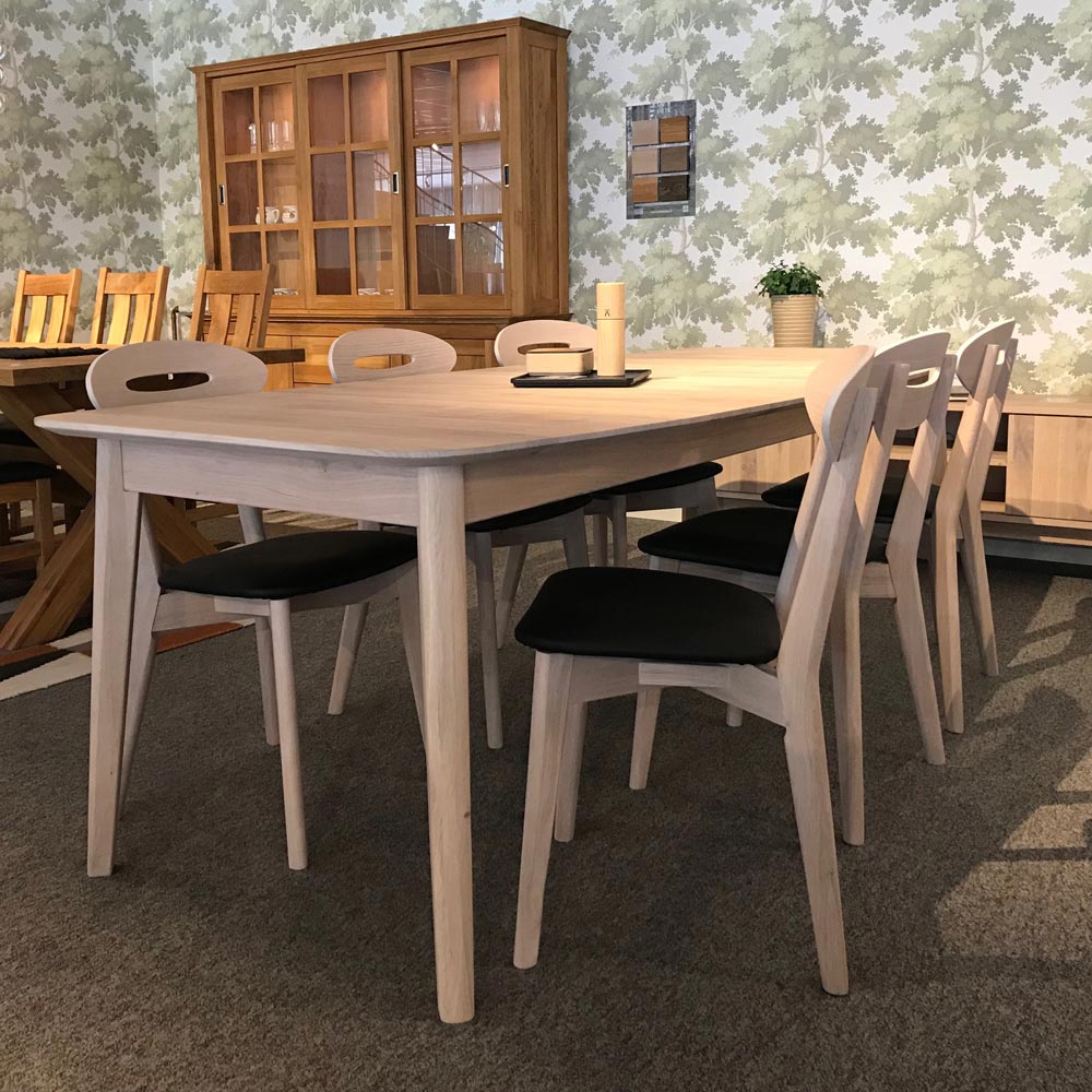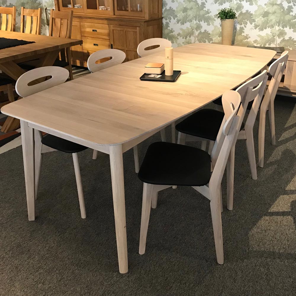 Rock N Roll matsalsserie är en mycket populär serie hos Nilssons! Bord och stol i vitoljad ek, L113. Rock N Roll matbord har en riktigt stabil och praktisk utdragsfunktion. Rock N Roll stol i smäcker Retro-design med svart skinnsits!