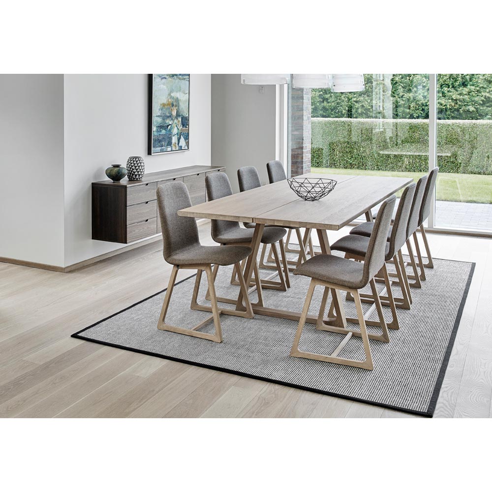 SM106 matbord tillsammans med SM40 stol från danska Skovby är en exklusiv matgrupp med en design som gör skillnad! SM106 matbord i massiv vitoljad ek. Hela längsgående plank med en delning i mitten av bordet. SM40 stol och SM106 matbord har ett snyggt ”slädunderrede” i samma design.