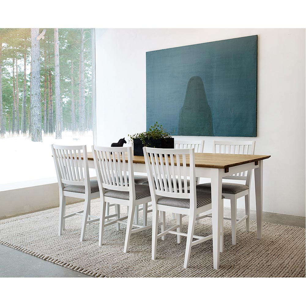 Viggsö stol tillsammans med Ekliden matbord från Torkelson. Viggsö stol i vitlack med randig tygsits. Ekliden matbord med skiva i massiv oljad ek/ underrede i vitlack.