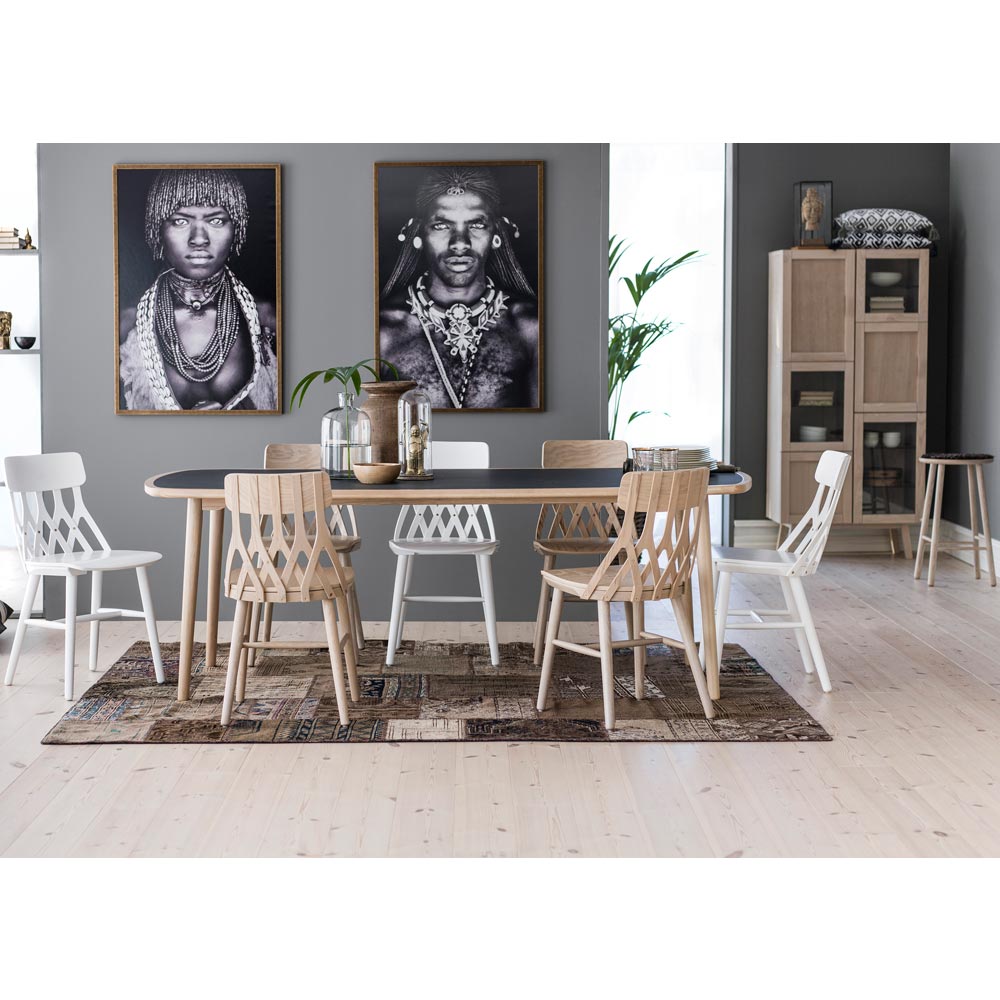 Y5 stol har ett helt unikt formspråk med sina 5st uppochnervända Y:n i ryggstödet. Sittkomforten är som alltid mycket bra när det gäller stolar från Hans K! Y5 stol finns i Blond ask, oljad ek,vitlack och svartbets. Colibri matbord med bordsskiva i svart linoleum/ Blond ek.