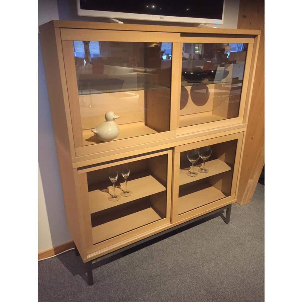 Modo vitrin i tvålbehandlad ek från danska Skovby. Skjutdörrar. Metallunderrede.