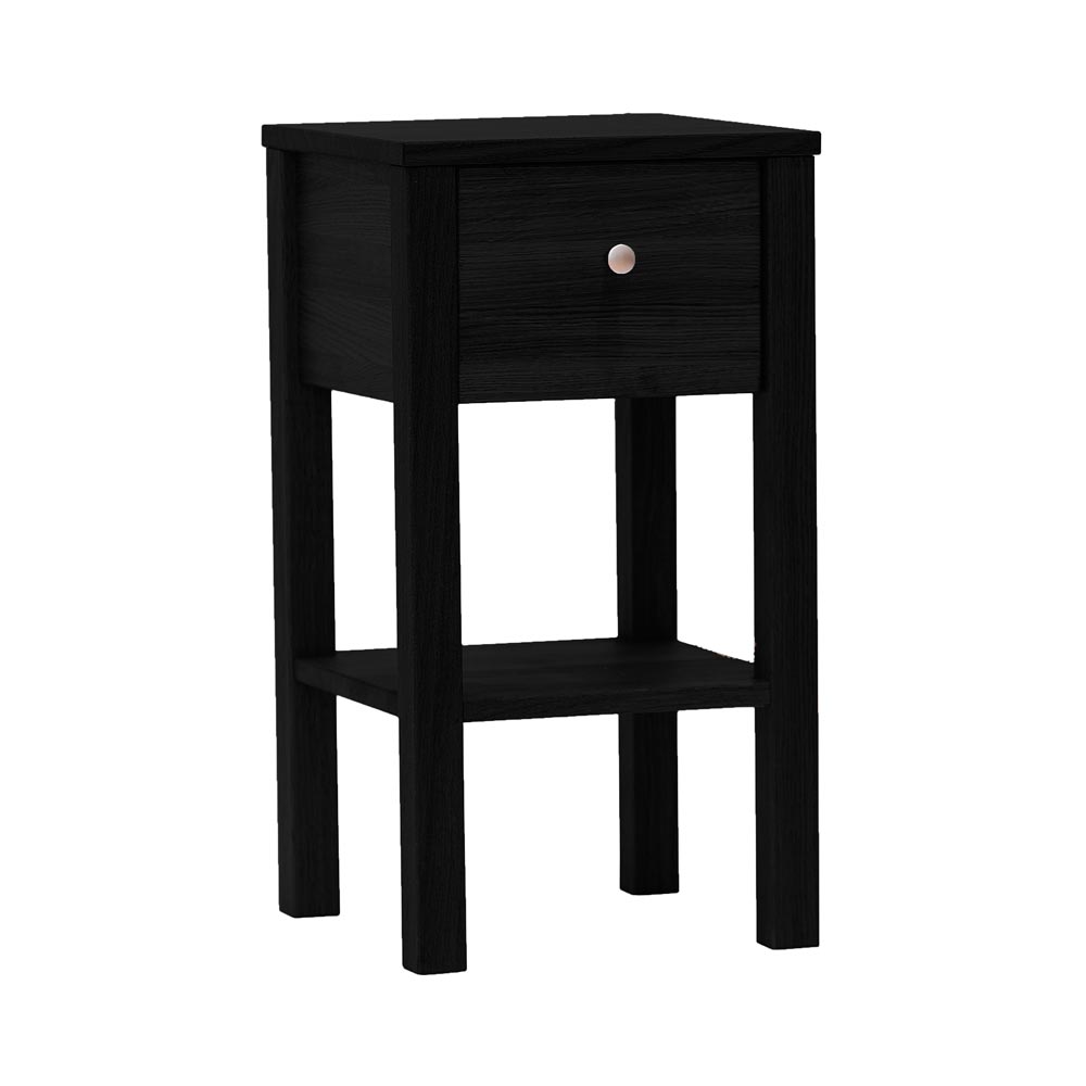 Saga sängbord i svartbetsad ek. Stilren och tidlös svensk design. Saga sängbord levereras fabriksmonterat med en gedigen kvalité!