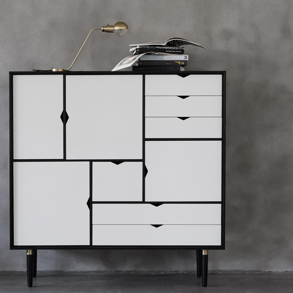 S3 highboard är en förvaringsmöbel som ingår i en produktserie från danska Andersen. S3 har en stomme i massiv svartbetsad ek med fronter i vit laminat. Även lådramarna är massiva och möbeln har snyggt svarvade ben med mässingskragar upptill. Klassiskt hantverk med tydliga snickeridetaljer och synliga tappförband. En genomarbetad möbel som andas stil och klass!