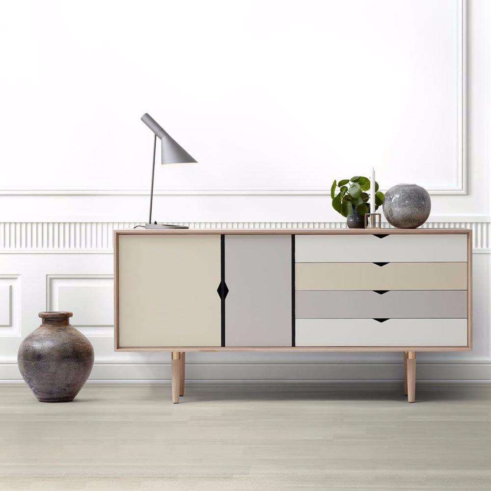S6 sideboard är en praktiskt förvaringsmöbel som ingår i en produktserie från danska Andersen. Klassiskt hantverk med tydliga snickeridetaljer och synliga tappförband. S6 sideboard är tillverkat i massiv såpad ek med laminatfronter i grå och beige nyanser. Förvaringsmöbeln har både luckor och lådor och snyggt svarvade ben med mässingskragar upptill!