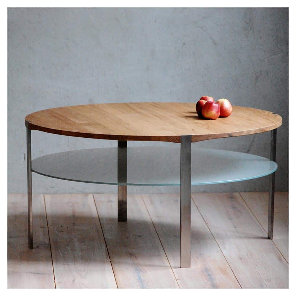 Furillen soffbord runt 90 vitoljad björk/ rostfritt stål/ frostat glas 14.700:-. Furillen soffbord utan glashylla -2.000:-. Finns även i höjd 53cm +250:-. Även i andra storlekar!