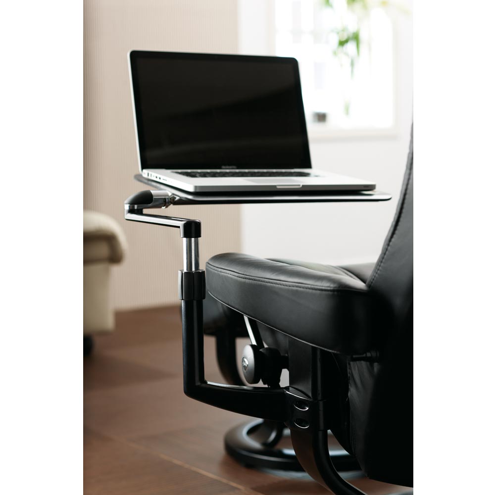 Stressless Computerbord från norska Ekornes är anpassat till Stresslessfåtöljer med Classicunderredet. Bordet påverkas inte av fåtöljens glidfunktion, så du kan ändra sittställning utan att behöva flytta det du har på bordet.
