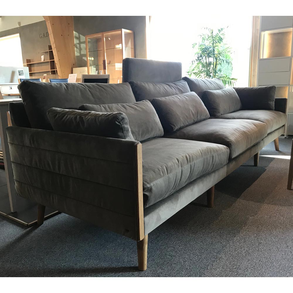 Smäckra fina armstöd med trädetaljer i oljad ek och liggande dekorsömmar på utsidan. Den tunna stommen ger soffan ett mycket luftigt intryck. Soffan är klädd i tyg Seven shitake 124. Nackkudde och svankkuddar ingår ej i priset utan väljs som tillval.