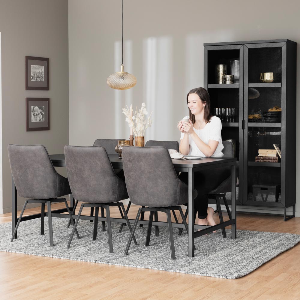 Alison stol i mörkgrå microfiber och underrede med snurrfunktion i svartlackad metall från Rowico.