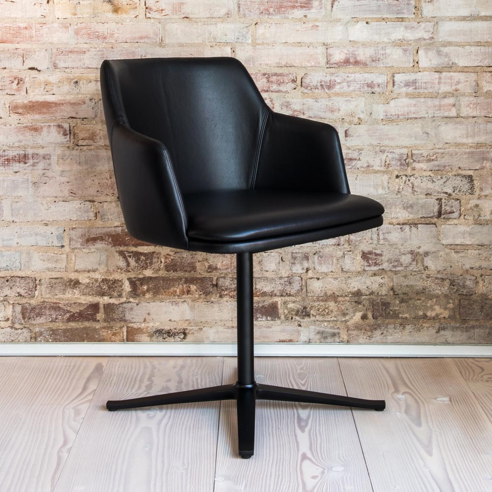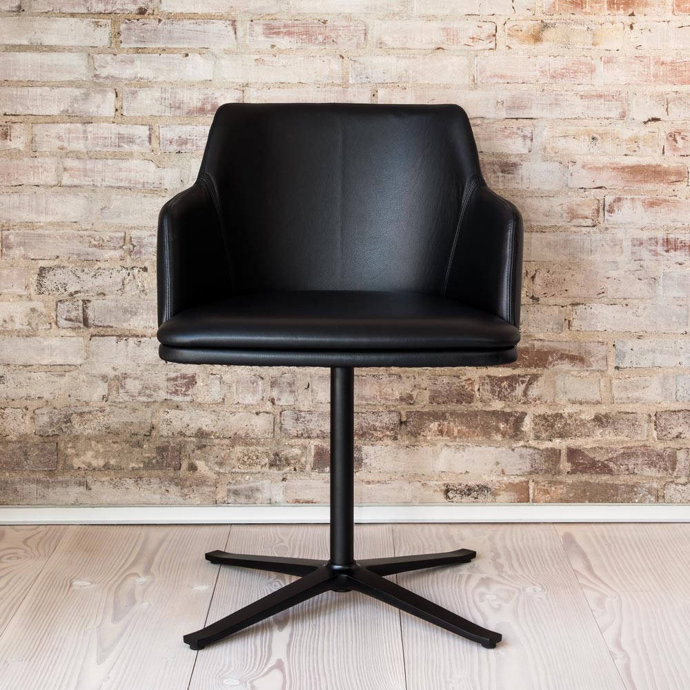 SM55 karmstol med snurr finns att köpa i många tyger och skinn. Snurrfoten finns även i blank alu. Karmstolen kan också köpas med ben och heter då SM65.