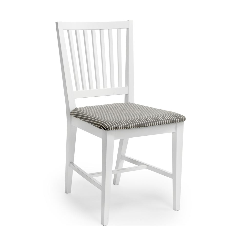 Viggsö stol i vitlack från Torkelson. Stilren Leksandsmodell med H-slag mellan benen gör stolen stadig. Randig tygsits.