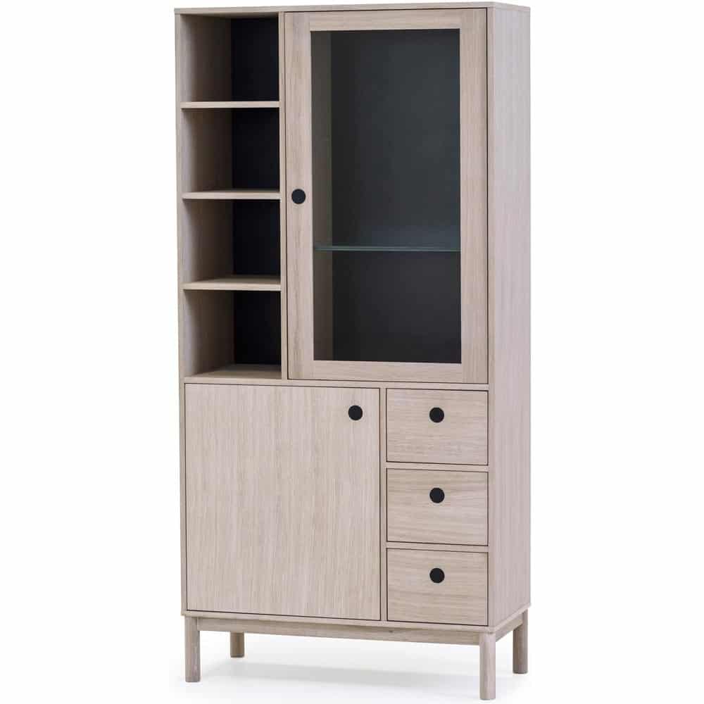 Bridge vitrinskåp i massiv /fanerad vitoljad ek från Torkelson. Tre lådor och ett skåp undertill och öppna hyllplan samt skåp med glasdörr upptill. Push-beslag som gör det enkelt att öppna lådor och skåp med ett tryck. Fint att kombinera med andra möbler i samma serie