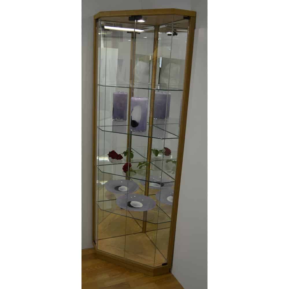 Ryggen i skåpet kan även väljas med vanligt glas, träfanér eller lackad. Venedig hörnvitrin finns att köpa i oljad ek, svartbetsad ek, lackad björk, ljus och mörk mahogny, lackad bok, vitlack och svartlack. Dörren öppnas med ett diskret pushbeslag i krom som sitter längst upp på skåpet.